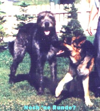 Kurz nachdem Cindy 1993 unsere Familie ergänzt hatte, bekam unser Freund Karl seinen genau so gutmütigen Schäfer Sam. Und Sam liebte Cindy. Sie fegten über die Felder oder durch den Garten bis zur absoluten Erschöpfung, wobei Cindy einmal sogar Karl, immerhin stattliche 1,90 m groß, beim Verfolgen von Sam wie einen Baum fällte, da sie den engen Kurvenradius von Sam nicht ganz halten konnte. Nach Cindy's Tod '97 wollte Sam einfach nicht glauben, dass sie nicht mehr im Auto sitzt, wenn wir kamen. Er untersuchte jedes Mal stürmisch auf's Genaueste Fahr- und Kofferraum, bevor er dann anschließend etwas enttäuscht mit uns Vorlieb nahm. Jetzt, Mitte September 2003 folgte er ihr. Vielleicht fegen sie ja nun wieder gemeinsam irgendwo anders rum.